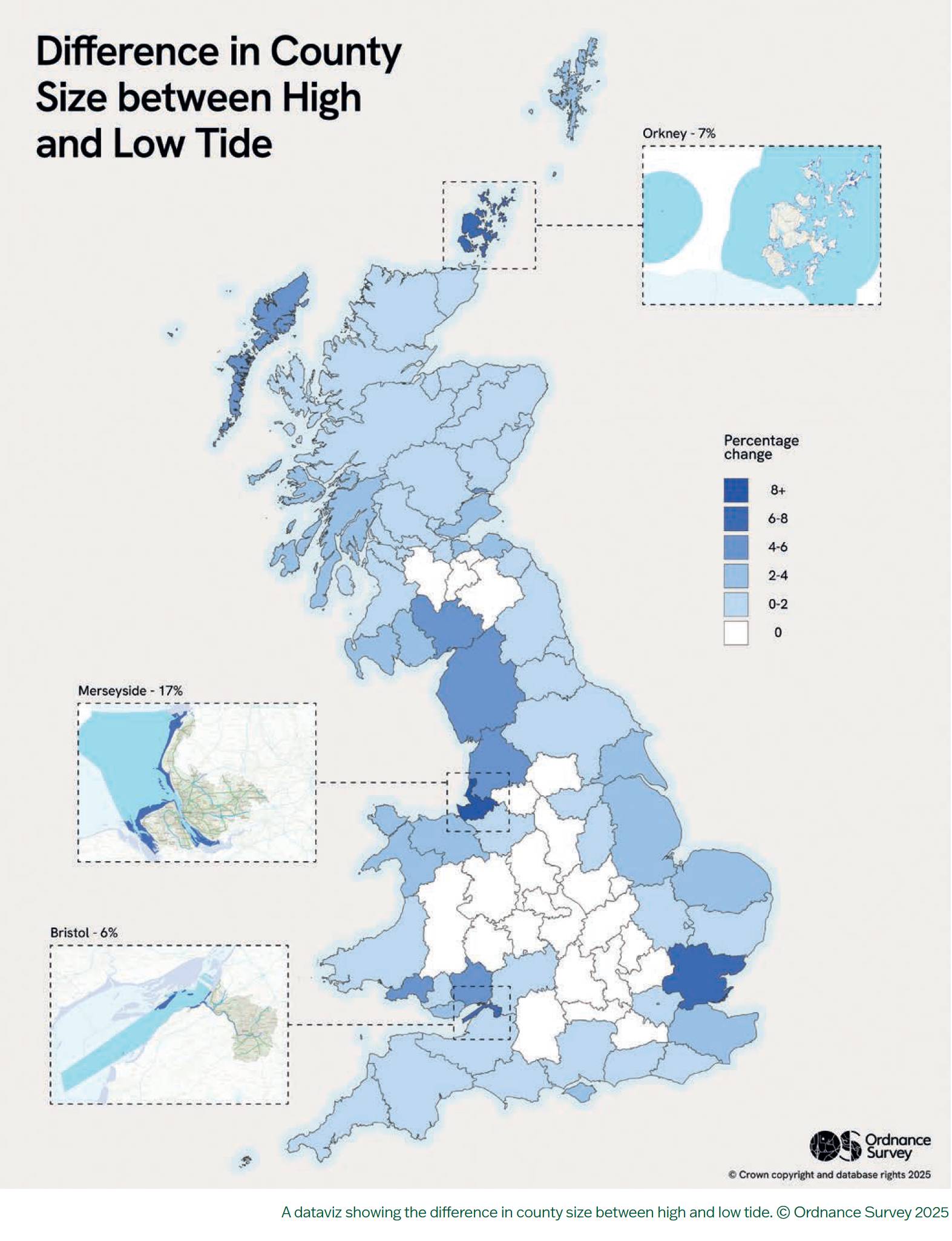 Following the release of the continuous tidelines dataset, OS has ranked all ceremonial counties in GB by their percentage change in size between high and low tide. Merseyside comes out top, much higher than the others, with a nearly 17% difference in high and low tidelines.