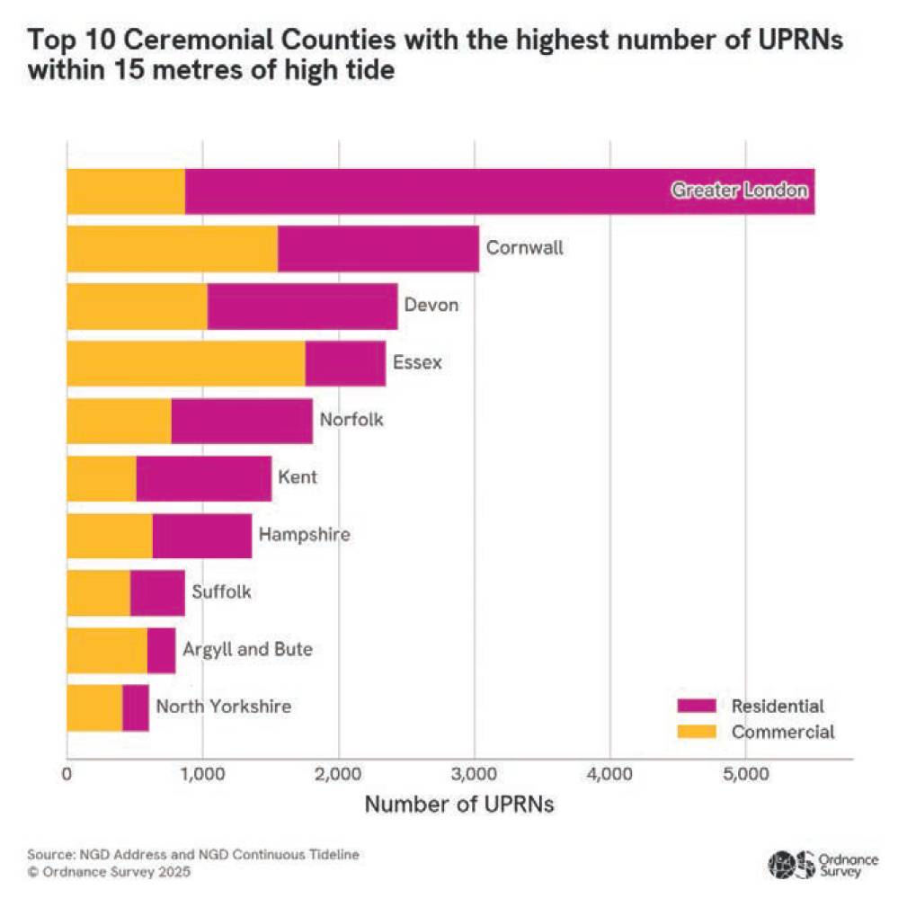 Combining the tidelines data with UPRNs in ceremonial counties shows that Greater London has by far the highest number of commercial and residential properties within 15m of high tides – around 5,500.
