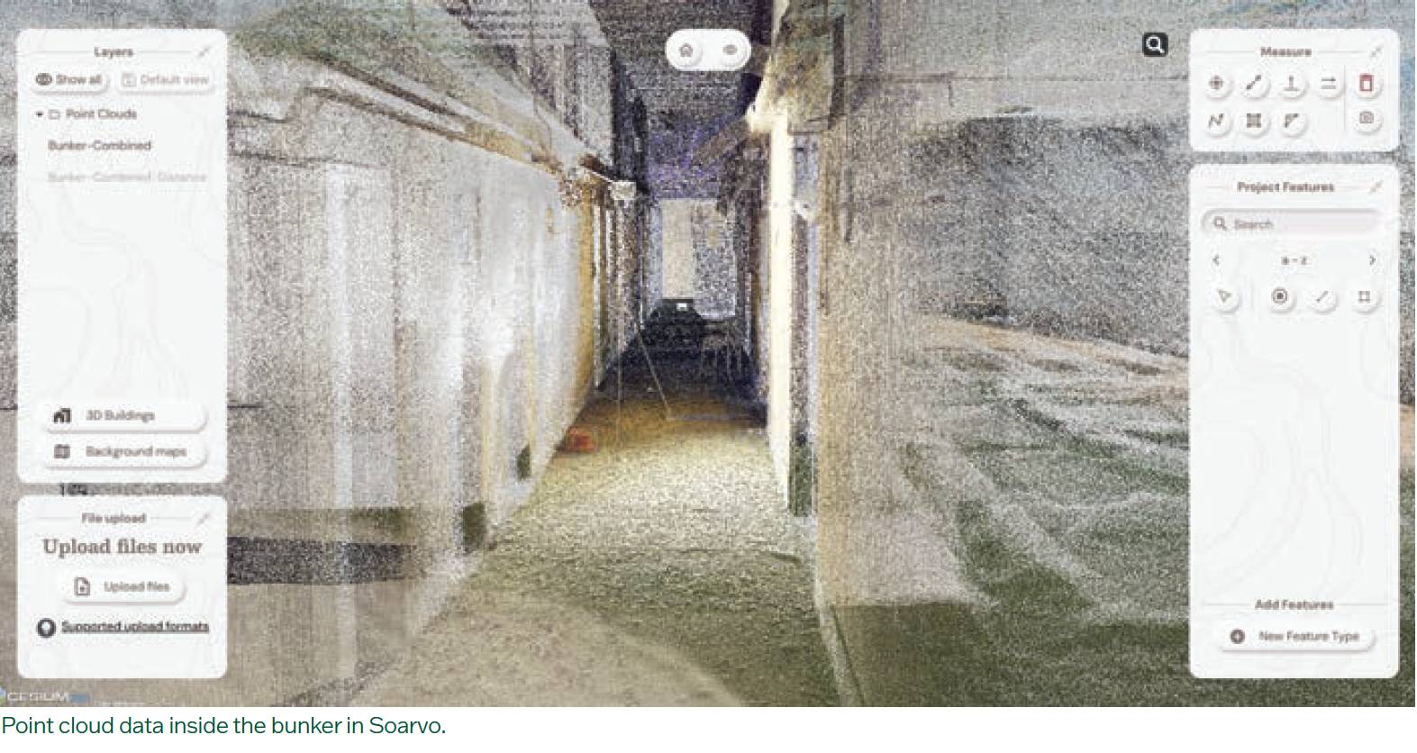 FlyThru – specialist in manned and unmanned aerial data collection – was responsible for all the survey work, above and below the ground. This included an underground survey of the bunker, which had never been accurately mapped due to collapsed sections. A confined-space drone, protected by a cage, was used to navigate the semi-blocked areas safely.