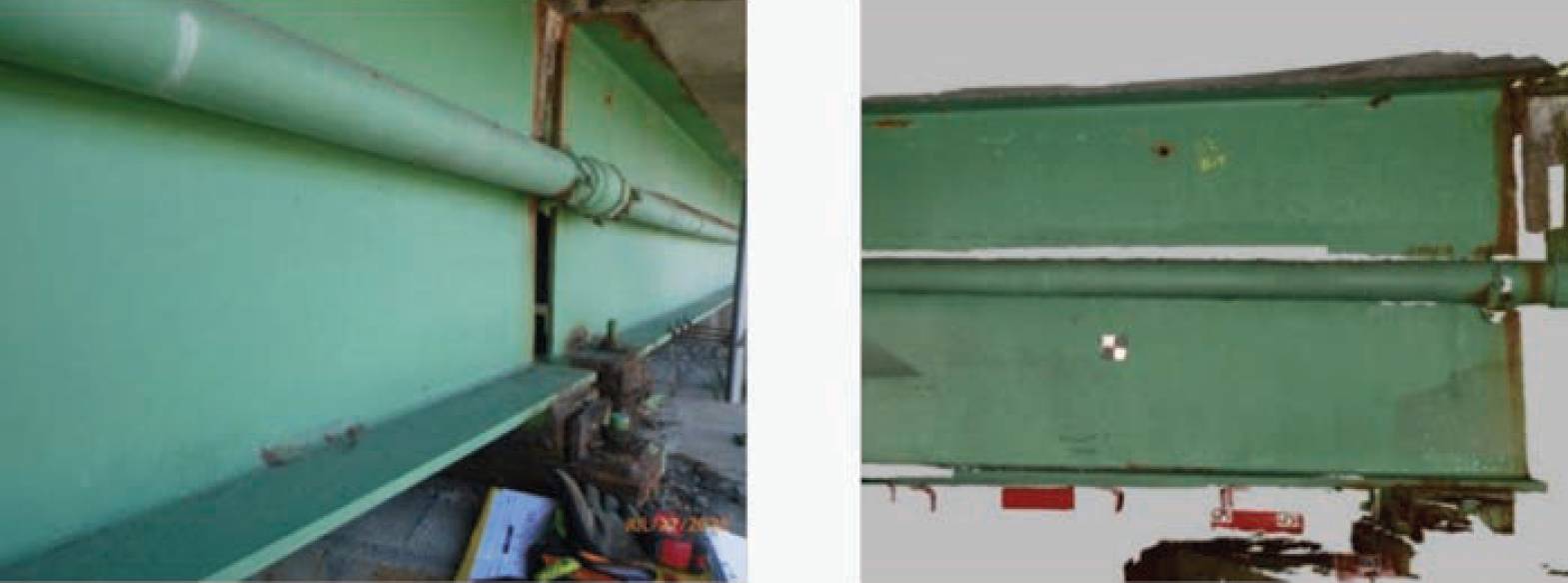 Steel bridge girders showing signs of deterioration (reflected in the captured 3D scan data).