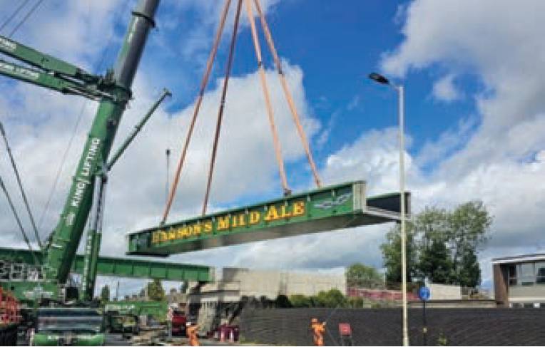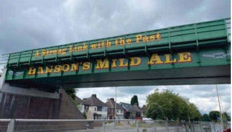 A new bridge for West Midlands Metro Wednesbury to Brierley Hill Metro extension has recently been installed, representing a significant upgrade on the original. Designed by Tony Gee as a partner of the Midland Metro Alliance, the bridge was installed across Birmingham New Road, Dudley, with the new structure featuring a familiar design iconic to the local area. A specialist signwriter was engaged to create the distinctive brand colours and lettering advertising Hanson’s Mild Ale, similar to the original bridge.