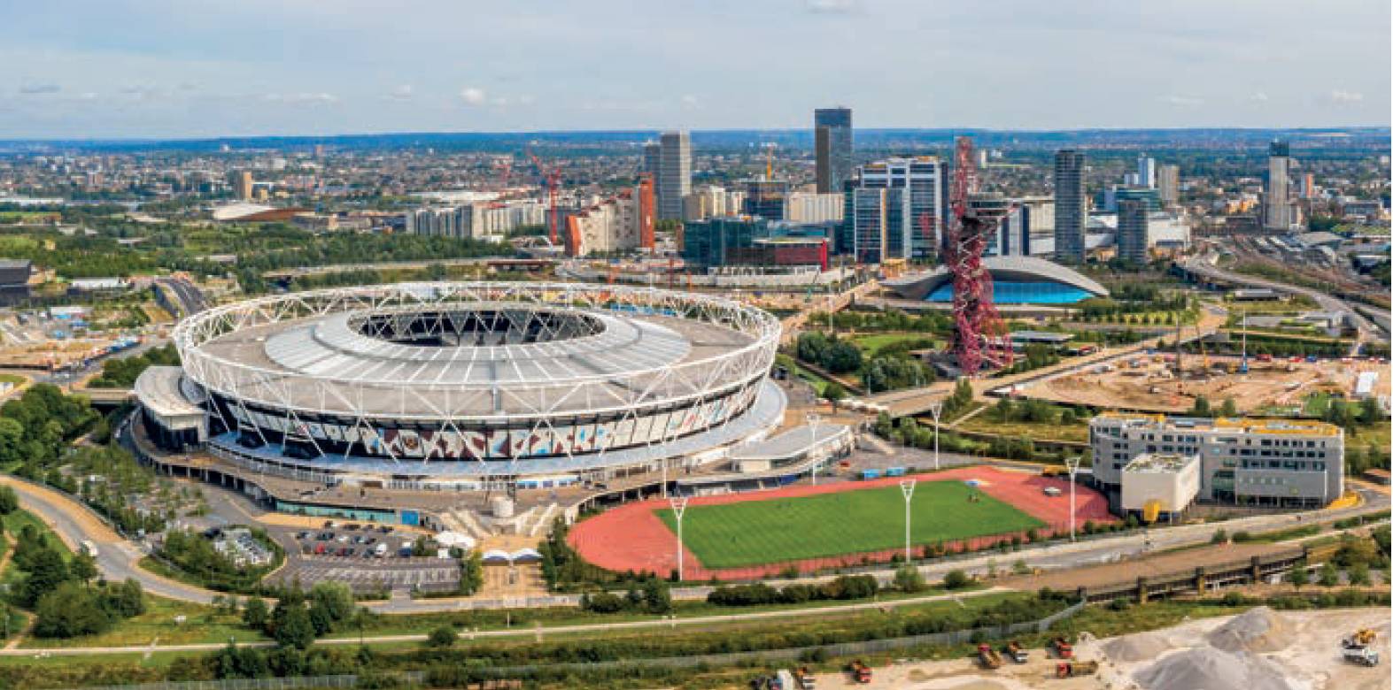 Aerial view of the Olympic Park in London with the Olympic Stadium and the ArcellorMittal Orbit tower. ©Aerial Film Studio
